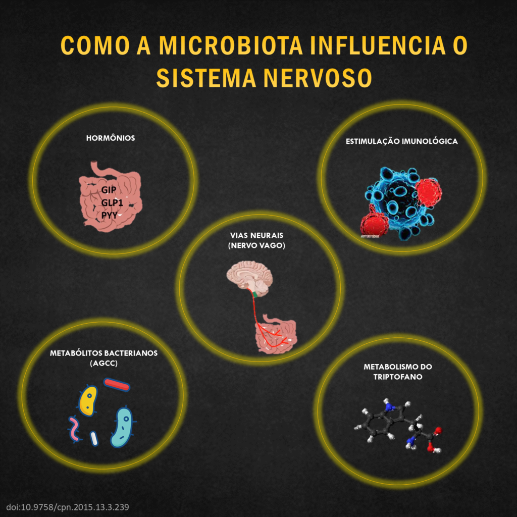 Embora os mecanismos exatos ainda estejam sendo elucidados, várias vias diretas e indiretas foram propostas pelas quais a microbiota intestinal pode modular a função e o comportamento do cérebro, principalmente através da inflamação. Uma dieta de estilo ocidental com alto teor de gordura, por exemplo, resultou em um aumento da proporção de Firmicutes(bactérias “ruins”)/ Bacteroidetes (“bactérias “boas”) , bem como redução do comportamento exploratório, aumento da ansiedade e diminuição da memória em modelos de roedores.